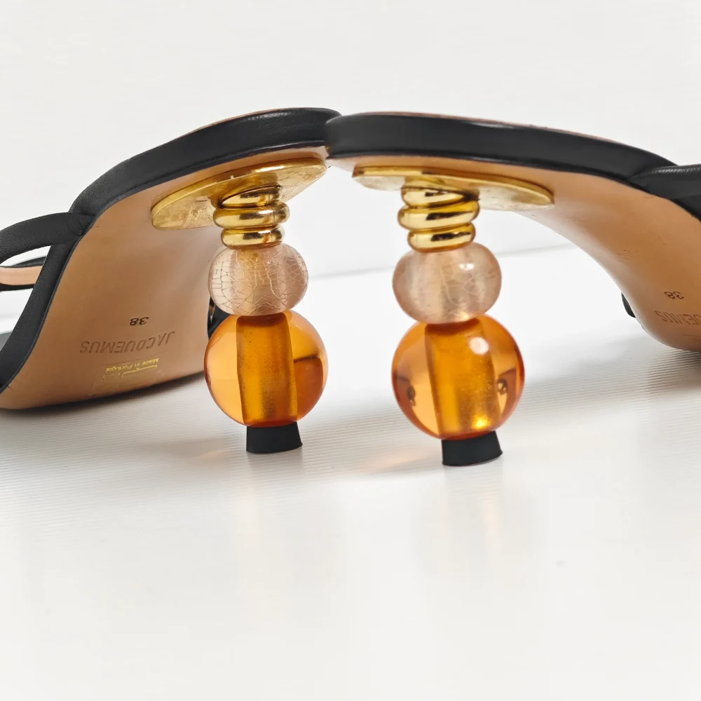 Made from slender leather straps that curve around the foot, these Noli sandals by Jacquemus set on ornate glass beads that subtly reflect the light. They’re just the right height to complement cropped jeans and midi skirts.