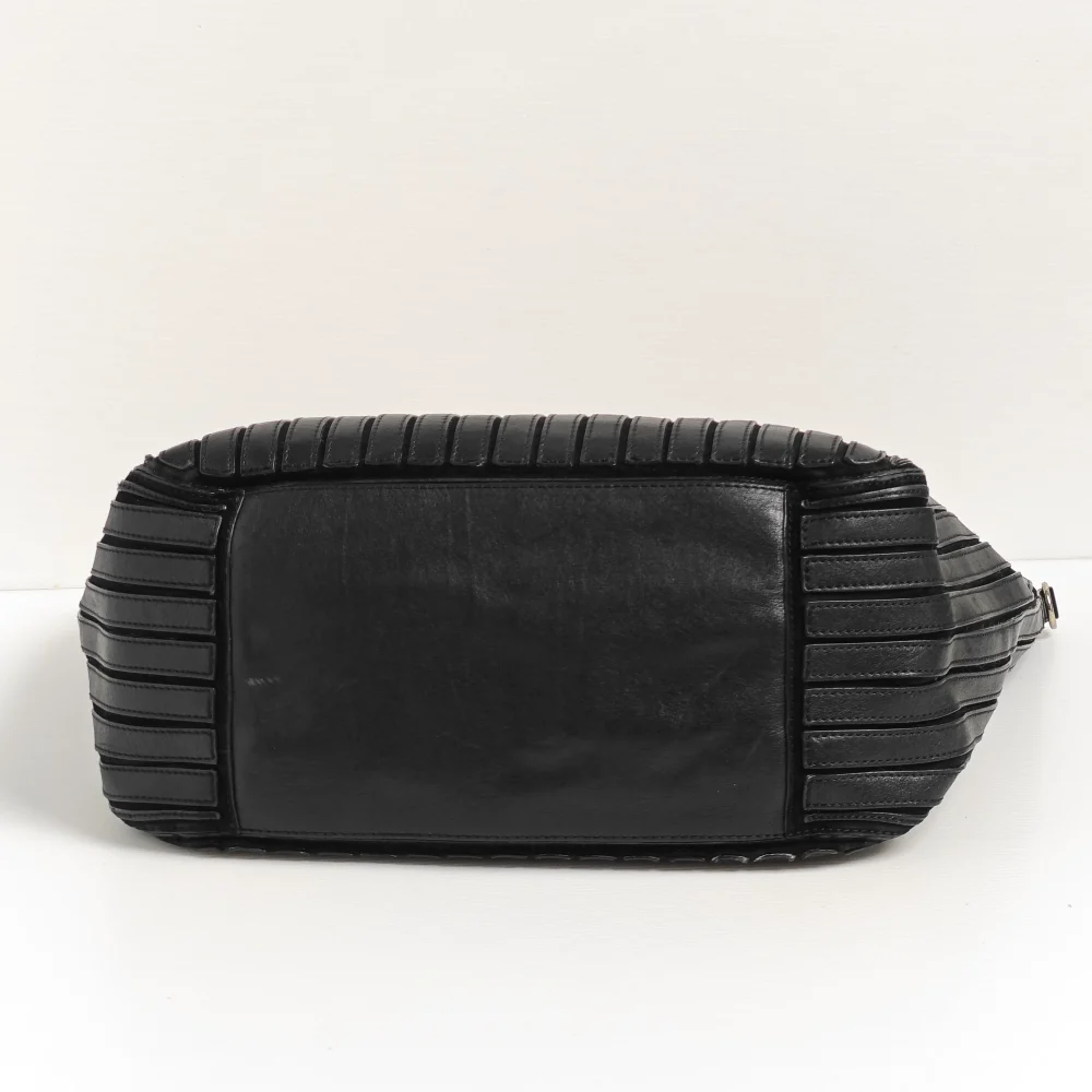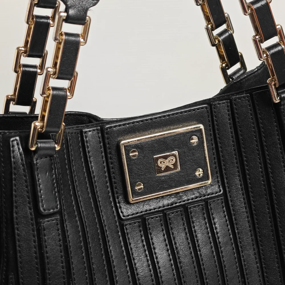 - Flat leather handles with chain link details.