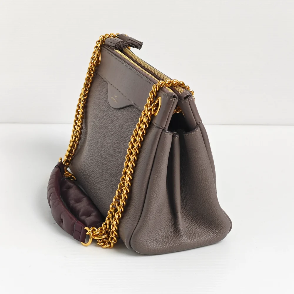 In neutral taupe grey colour, this chain bag is easy to match in any wardrobe. Classically Anya’s unexpected character – the handle is detailed with “Chubby” puffy leather pads in burgundy colour for a little contrast.