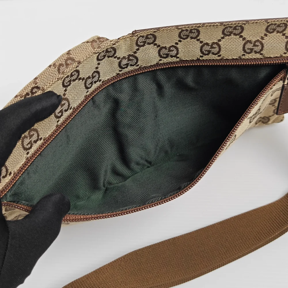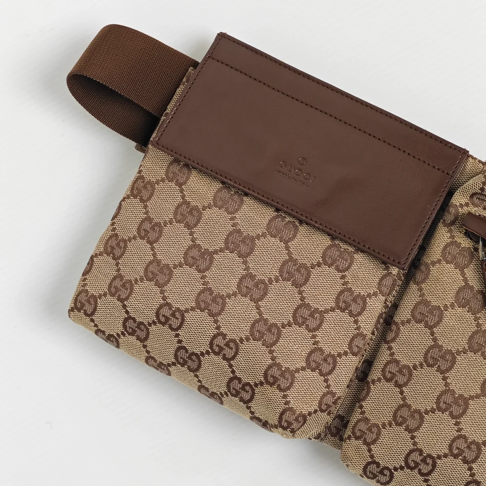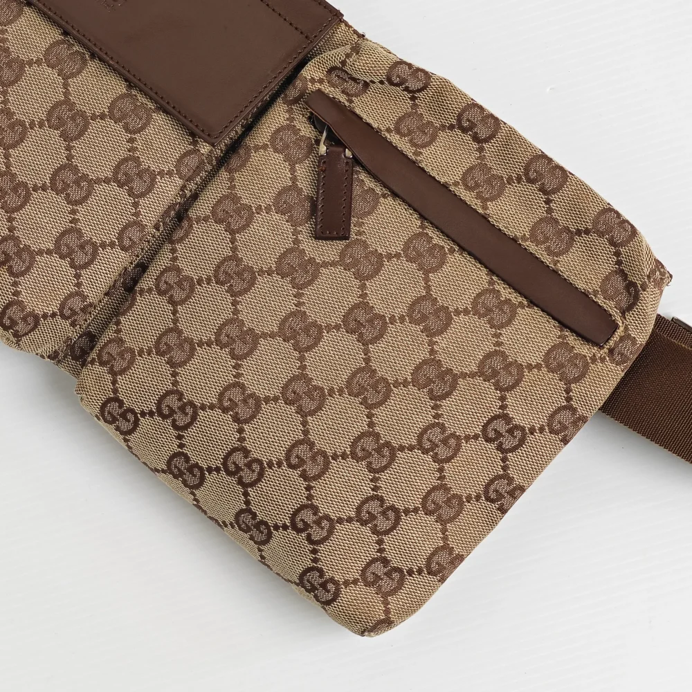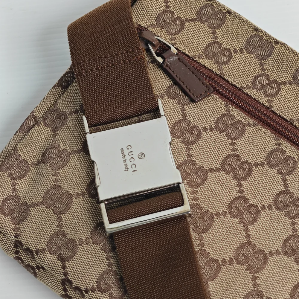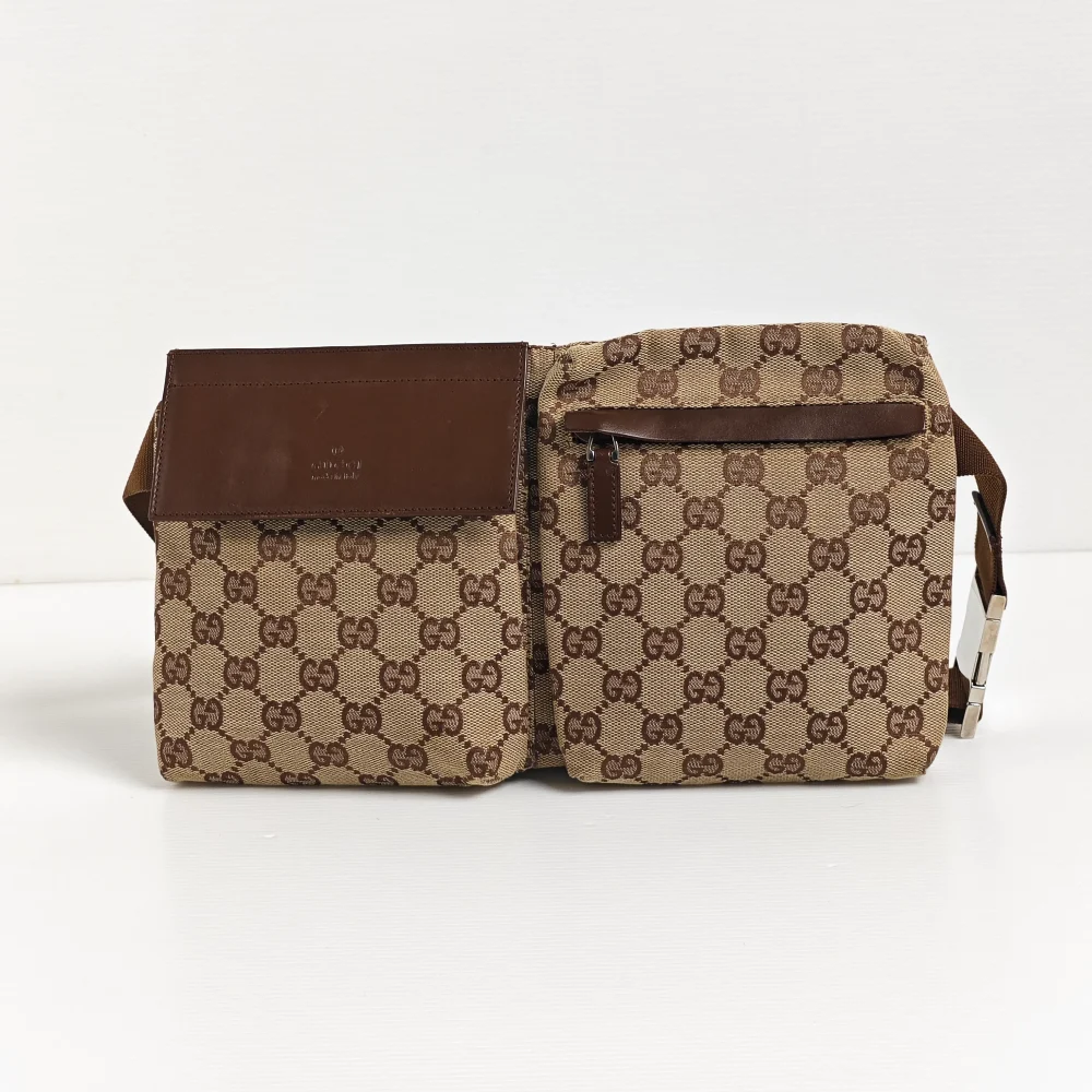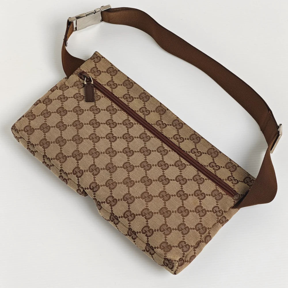 A stylish way to casually carry the basic essentials. One of the classic 2000s Gucci designs, this GG monogram waist bag is light and soft to wear closely on you. It has 1 large back zipped compartment and 2 front pockets to carry your phone, card holder, small wallet, keys and etc.