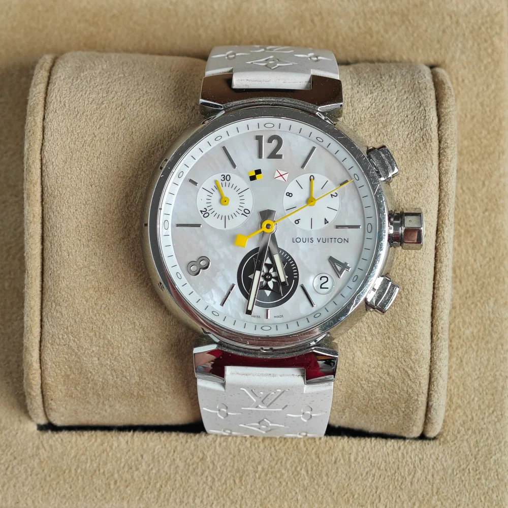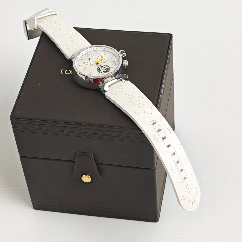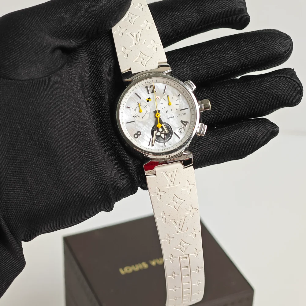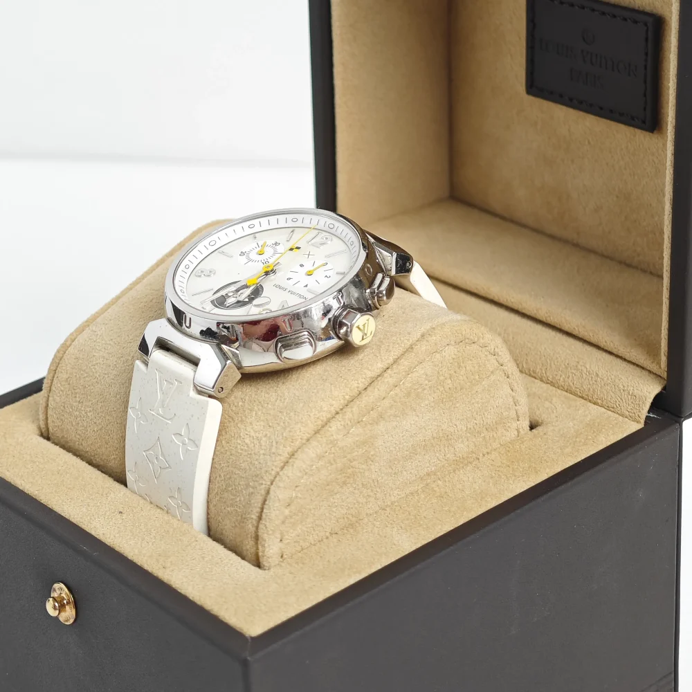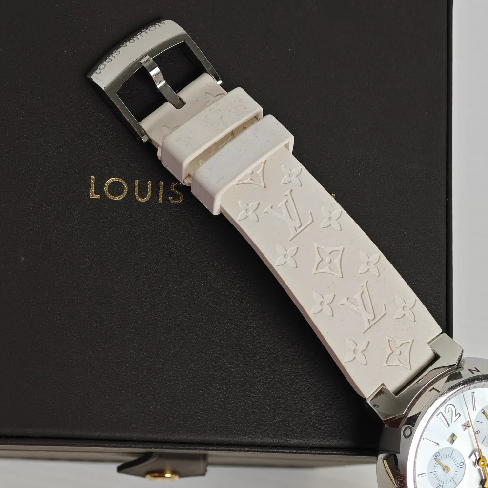 Introduced in 2002, the Tambour was Louis Vuitton’s first major watch collection and marked the brand’s serious entry into luxury horology. Tambour means “drum” in French, a reference to the distinctive drum-shaped, thick, round case that became the collection’s signature look.