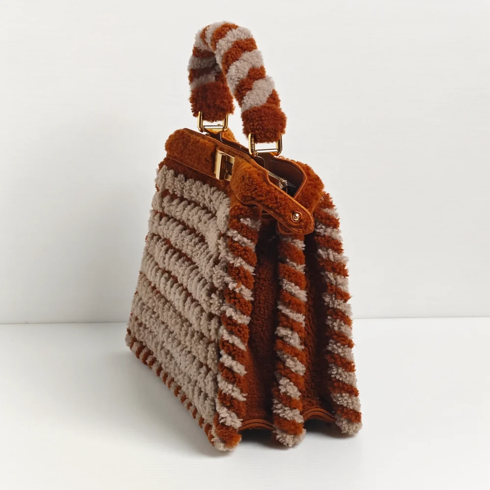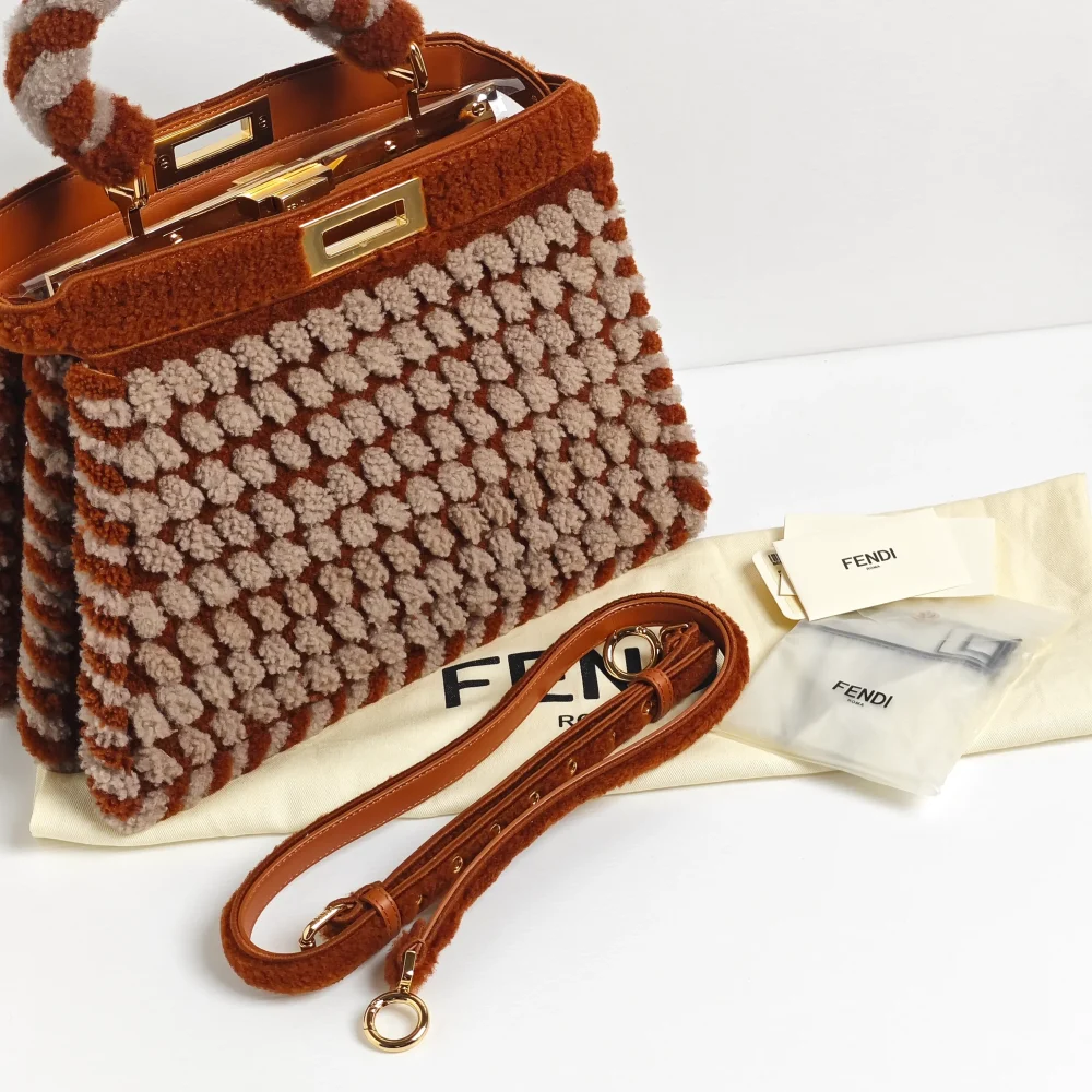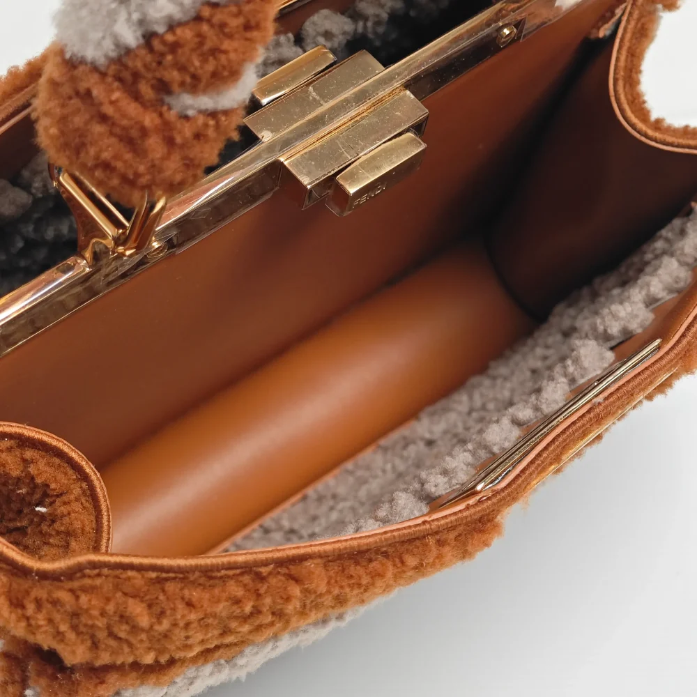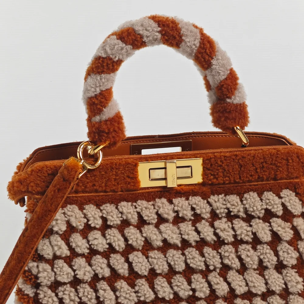 The privilege being Fendi’s premier icon is, it gets to be dressed up and refreshed every season. From fall winter 2023 collection, this ISeeYou Peekaboo is fully dressed in brandy brown + taupe grey sheep shearling fur, it was retailed for almost RM30k.